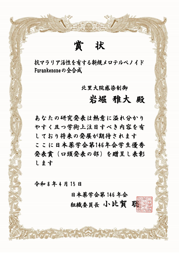 D1の岩堀 雅大さん(現 D2)が日本薬学会第146年会(2026.3、関西大学)にて学生優秀発表賞(口頭発表の部)を受賞しました。おめでとうございます! 2026 4/15 April 15, 2026 お知らせ D2の中原 大生さん(現 博士研究員)が日本薬学会第146年会(2026.3、関西大学)にて学生優秀発表賞(口頭発表の部)を受賞しました。おめでとうございます! 「論文」と「学会発表」を更新しました。
