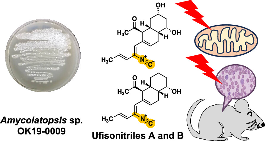 Ufisonitriles A and B, Antimalarial Isonitriles with Mitochondrial Function Inhibitory Activity Produced by Amycolatopsis sp. OK19-0009.